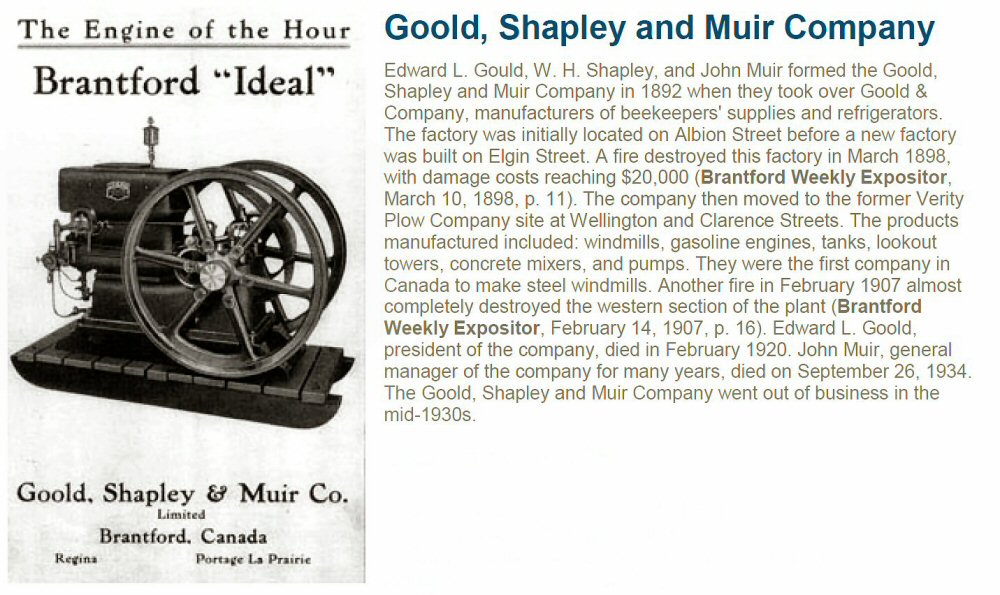 | Goold Shapley & Muir, Brantford Ontario Ernest Parent achète en 1911 un engin stationnaire horizontal de 15 hp de cette compagnie ressemblant à cet autre engin stationnaire de 8hp de la même compagnie ![]() ![]() Ici le video d'un autre engin stationnaire de 14 hp de la même compagnie ressemblant à celui du moulin Parent |
