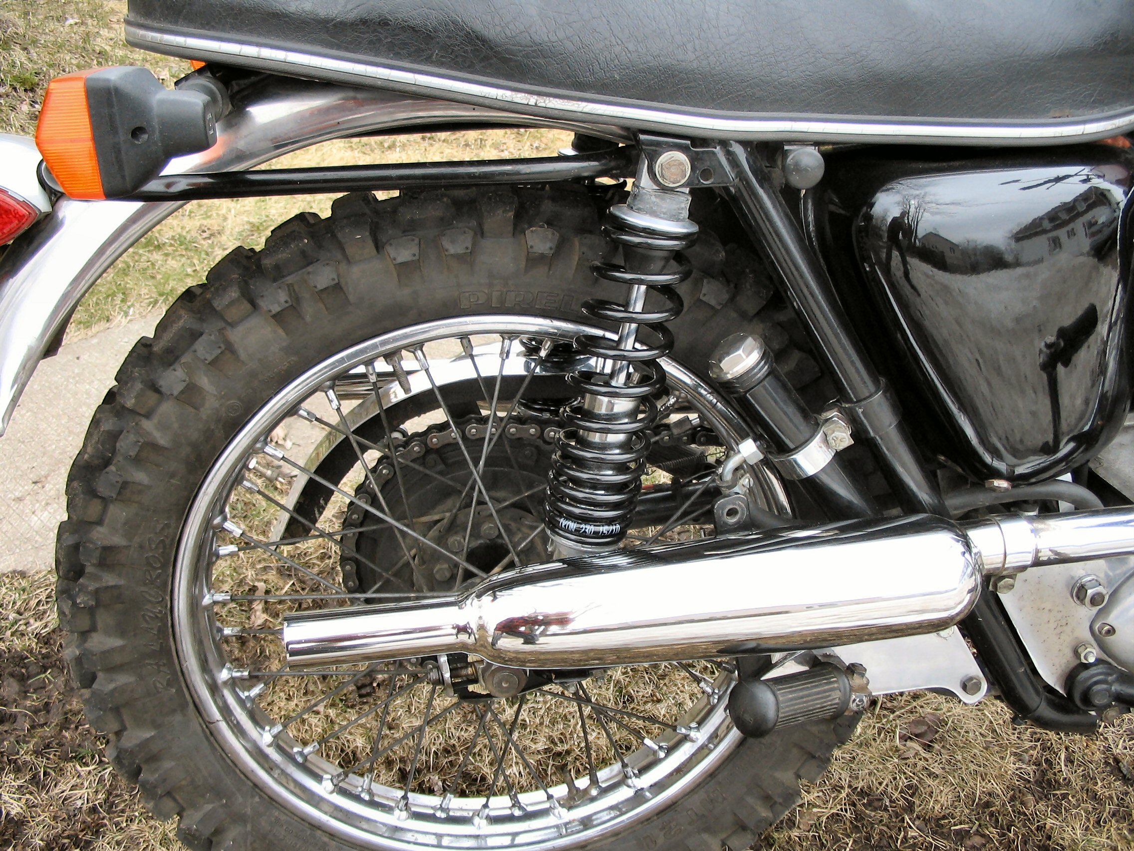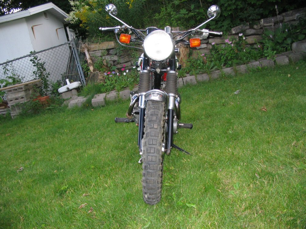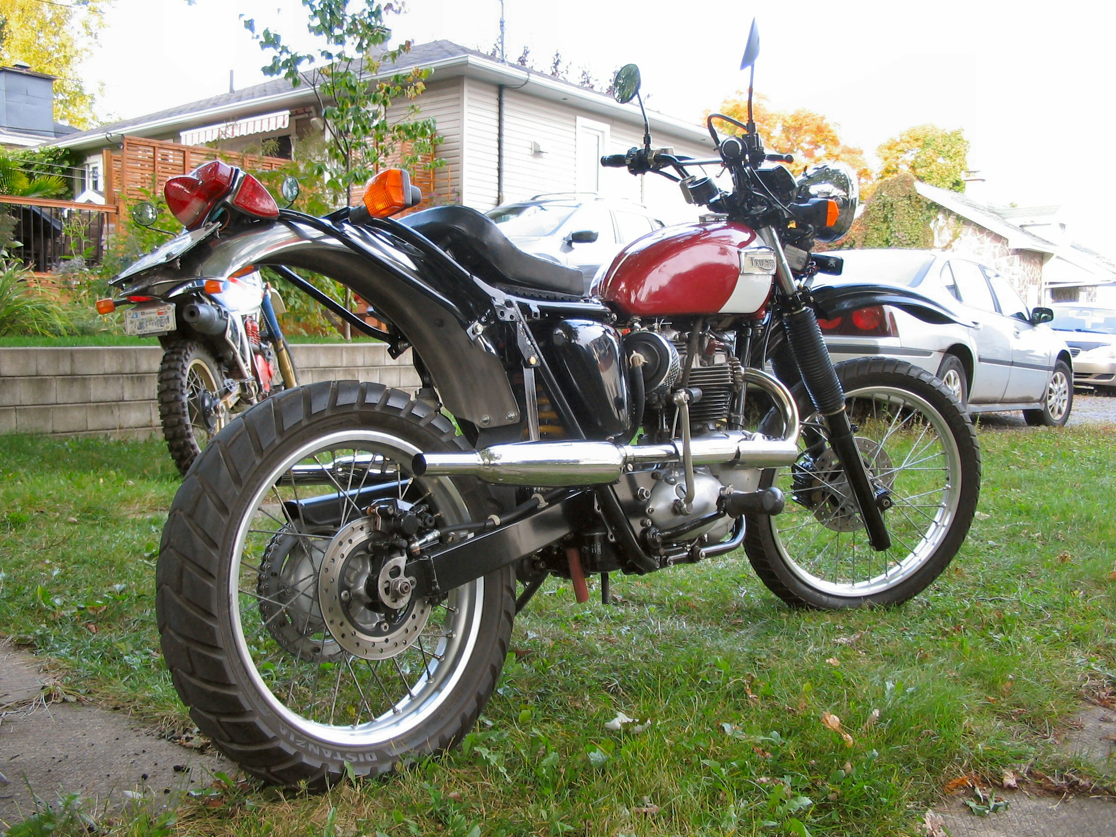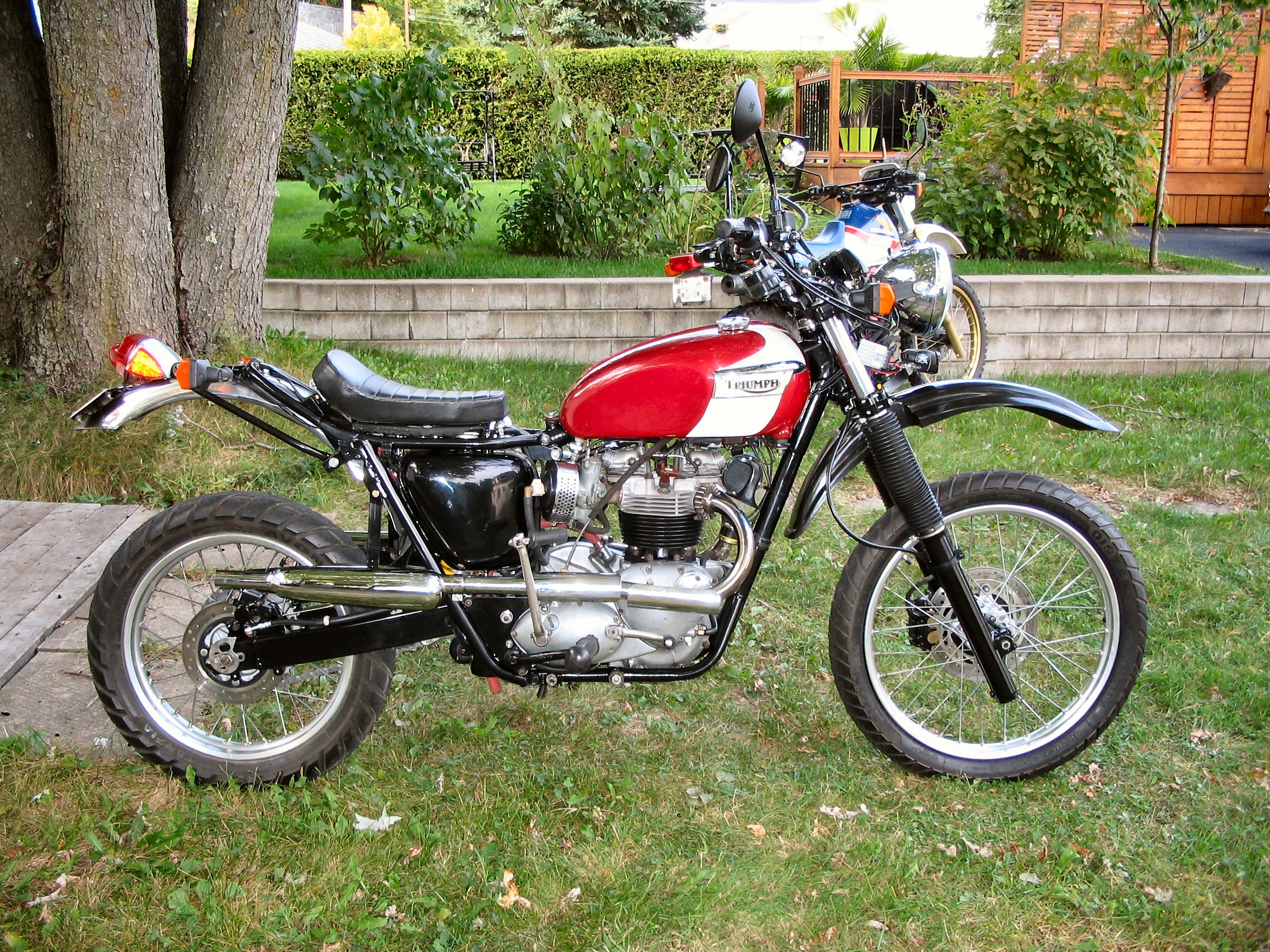 - Front frame T120R 1967 - Rear frame TR6C 1969 - Skid plate TR6C 1969 - Swingram Honda XR650L 2004 - Complete front fork Honda XR650L 2004 - Front wheel Honda XR650L 2004 - Front brake Honda XR650L 2004 - Top yoke & stem Honda XR650L 2004 - Rear mono-shock Honda XR650L 2004 - Complete rear wheel Honda XR650L 2004 - Front fender Honda XR650L 2004 - Race Tech Triple-Rate Fork Spring Kit - FRSP 3750K - Race Tech Gold Valve Fork Kit Type 1 - FMGV 2040 - Rear fender TR6C 1969 - Exaust pipe T120C 1966 - Muffler TR6C 1967 - Complete footrest TR6C 1969 - Seat Flat-Track Universal - Petrol tank T120R 1970 - Oil tank T120R 1967 - Norton oil filter kit - Crankcase T120R 1967 - Gear box TR6C 1969 - Clutch complete T100R 1972, with 7 Plate Clutch Conversion Aerco UK Made PN# TBS-0213; Barnett heavy-duty springs - SRM 3 spring models Pressure plate kit - Magura Hydraulic Clutch conversion Rask Cycle HYC2 - Crankshaft T120R 1972 - Rocker box T120R 1967 - Cylinder head T120R 1972 - Morgo Unit Rotary Oil Pump - PS215 Routt 750 big bore kit& Stainless O-Ring - Carrillo conn-rods - Pazon TwinPlug/cylinder PD2TP - Headlamp shell T120R 1968 - Light unit Yamaha Road Star - Philips Lumileds 20W - Rigid Industries LED Lighting - SR-Q - Flood - Single 20W - Tail lamp T120R 1969 withLED conversion for L679 & L917, 12V - Lucas High-Output 3-Phase Alternator 180 watts RM24 47244 - Rectifier/Regulator Shindengen FH020AA MOSFET, 1D7-81960-00-00, 2018 Yamaha Super Tenere XTZ12JL - Light/Flasher/Run/Off switch Honda XR650L 2004 - Flasher set Honda XR650L 2004 - Speedometer Honda XR650L 2004 - Koso Digital TachometerBA4800R0 - Koso Mini 3 Amp & Volt MeterBA003190 - VEI Systems Dual Oil Pressure & Temperature D1-OPP-OTC-M - Innovate MTX-L Plus Digital WideBand Air/Fuel Ratio Gauge - Antigravity Batteries AG1201 - Air Cleaner Assembly - K&N TB-0300 Replacement Air Filter - RK 530XSOZ1 X-Ring Chain 122 links - Fiamm horn - Enduro handlebar - Hand guard, Probend CRM, Limited Edition Cycra OPS - Powell Peralta Bolt on Chain Tensioner - Front tire: Metzeler MCE Karoo-2 110/80-19 Avon Distanzia 90/90-21 Continental TKC80 90/90-21 Pirelli Scorpion Rally 90/90-21 54R MST Metzeler MC360 Mid Hard Front Tire 90/90-21 54M MST Michelin Desert 90/90-21 54R - Rear tire: Metzeler MCE Karoo-2 140/80-18 Pirelli MT21 RallyCross 120/90-18 Continental TKC80 120/90-18 Avon Distanzia 120/90-18 Pirelli Scorpion Rally 120/100-18 68R MST Pirelli Scorpion XC Mid-Hard 120/100-18 68M Metzeler MC360 Mid-Hard Rear Tire 120/100-18 68M MST - Système d'aération du moteur modifié pour le transfert et l'ajustement du niveau automatique de l'huile dans le boitier d'embrayage, ainsi que diverses modifications du boitier moteur pour éviter la tite goutte d'huile emmerdante sur le pavé quand on stationne. - Ainsi qu'une multitude de modification apportée sur toute la moto |